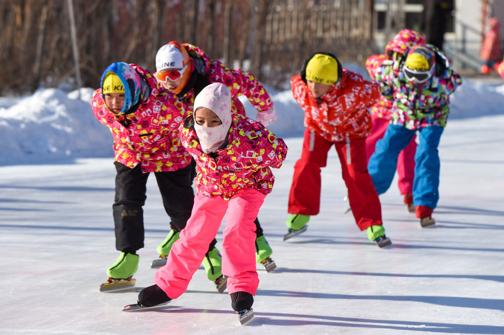 1月13日,在吉林省四平市六马路小学,学生们在冰场上滑行。新华社记者张楠摄