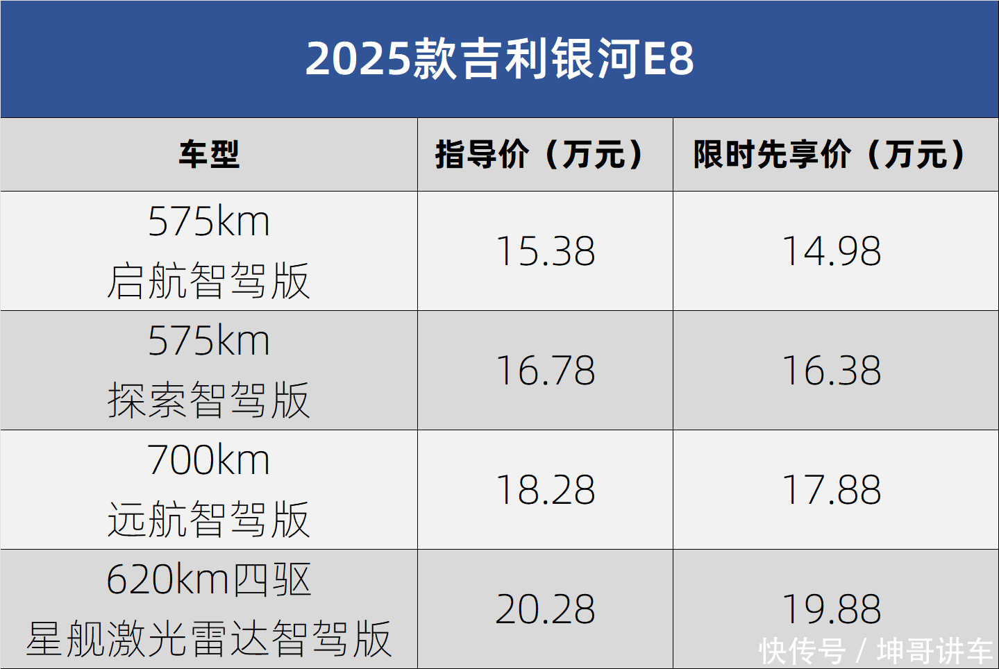 2025年3月3日晚间,2025款祯祥星河E8厚爱上市,新车推出4个车款供选,举座带领价区间为15.38-20.28万元,同期官方还公布了限时先享价区间为14.98-19.88万元。2025款星河E8主要升级了激光雷达交融智驾,并对外不雅内饰等细节进行了更新。同期,聘任雷神EM-P超等电混系统的星耀8 EM也厚爱首发。