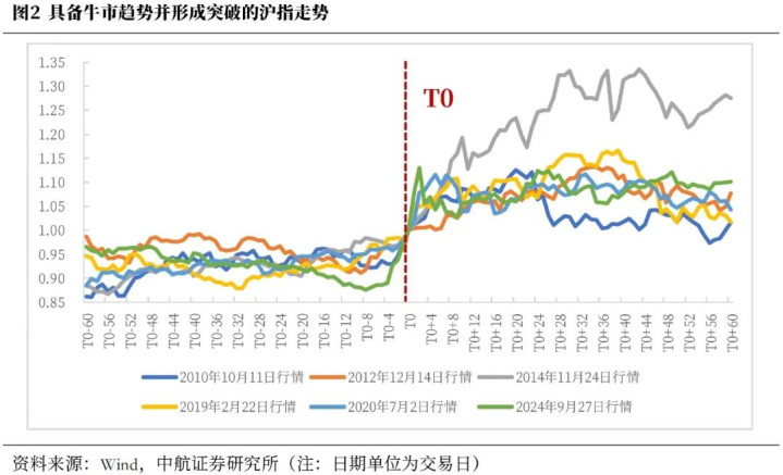 进一步,通过要求4证明,在券商领涨阶段下,A股冲突阶段性高点,或者率处于牛市行情中。考虑到市集关注度较高的心理关隘和关节点位不时以上证指数算作不雅测筹划,因此以上证指数冲突算作要求圭臬。通过要求4,咱们剔除了2015年大跌中,券商领涨但上证指数未冲突此前一个季度的高点的两段区间,咱们将这两段区间视为反弹而非牛市。剩余的6段行情中,咱们以上证指数冲突券商领涨起先前一季度高点的首个走动日志为T0,最终共获得6个走动日:2010年10月11日、2012年12月14日、2014年11月24日、2019年2月22日、2020年7月2日、2024年9月27日。