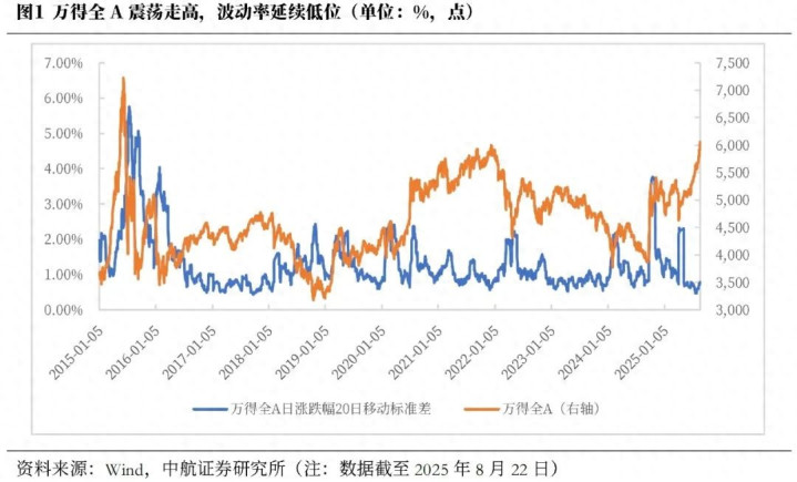 与以往不同,在“稳股市”的政策基调下,维稳政策推动市集稳步上行。本轮牛市于今已呈现出较权贵的慢牛特征,5月以来市集波动率多数时间处于近十年的较低水平,改日有望走成捏续性慢牛。自本轮“924”行情开启以来,政策端企稳本钱市集立场明确,撑捏股市造成慢牛神气。自前年“924”行情以来,政策层屡次强调任意推动中永远资金入市,强调积极实施长周期考查,提高权柄类基金限制和占比等。国度推动中永远资金入市交流下,对助力股市永远健康发展导向明确。在本年四月“平等关税”引发市集波动阶段,政策端捏续发力,国度队进场,保重市集幽静运行。近期“反内卷”联系政策导向又从供给端推动过时产能有序退出,有望加快推动中国经济转型发展。在政策撑捏下,近期市集稳步前行,万得全A轰动上行,缓缓冲突前高,且其波动率延续低位。为止8月22日,万得全A波动率仅位于近十年20%水平,露出出政策呵护市集幽静发展下,本轮市集或有望造成慢牛神气。