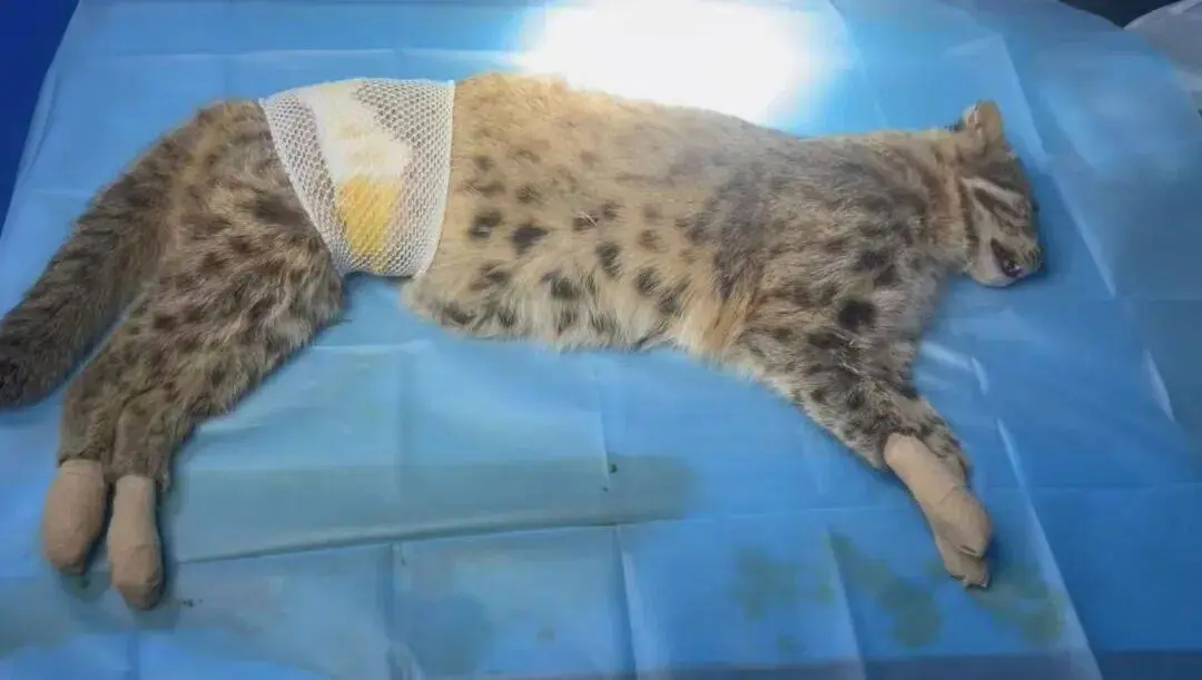 2025年12月16日朝晨,蓟州区露面岭镇丛林防火巡护员在闲居巡护中,发现一只成年雄性豹猫被困在护路铁丝网上,足部磨损、指甲断裂且腹部有昭着伤口,正处于应激抵抗状态。巡护员第一时间上报后,区林业局、镇政府赶紧联动市野灵活物救护中心北部片区救护站点,佩戴专科保定器、断线钳等器具前去现场,仅用20分钟便安全调停这只野生豹猫。经初步搜检,该豹猫体重9.25公斤,属朔方亚种成年个体,虽体表受伤但无关键健康风险,立地被送往北部片区救护站点罗致系统救治。