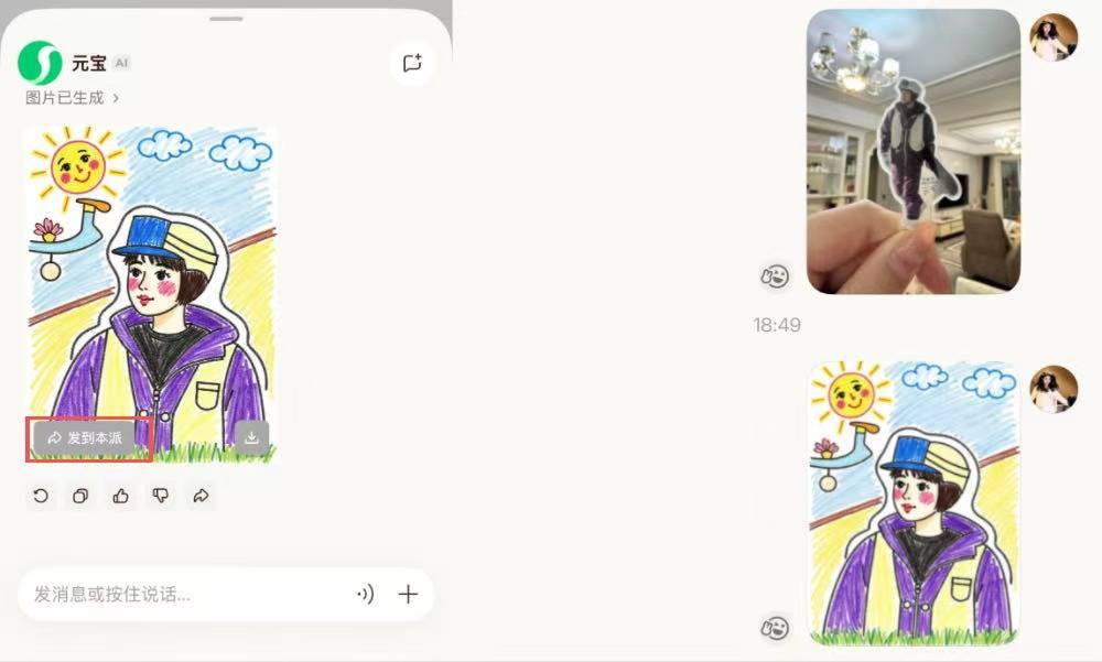 我此次选了“儿童画”。生成过程照旧肃肃的元宝对话界面,生成完成后,淌若合计法例还行,不错径直遴荐“发到本派”,让通盘东说念主全部看。