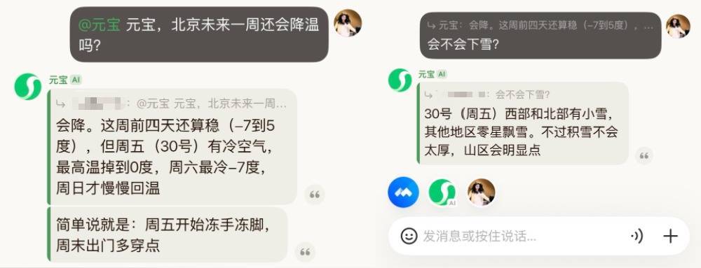 我试着输入一个问题“@元宝 元宝,北京异日一周还会降温吗?”