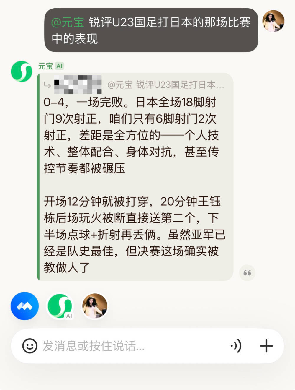 我在派里径直发“@元宝 锐评U23国足打日本的那场比赛中的发扬”,元宝不仅提供了射门、控球等数据,还归来了差距在哪、关节无理在哪的判断。