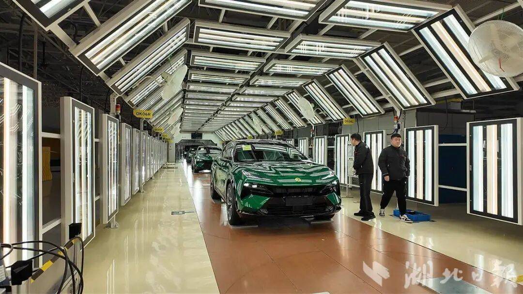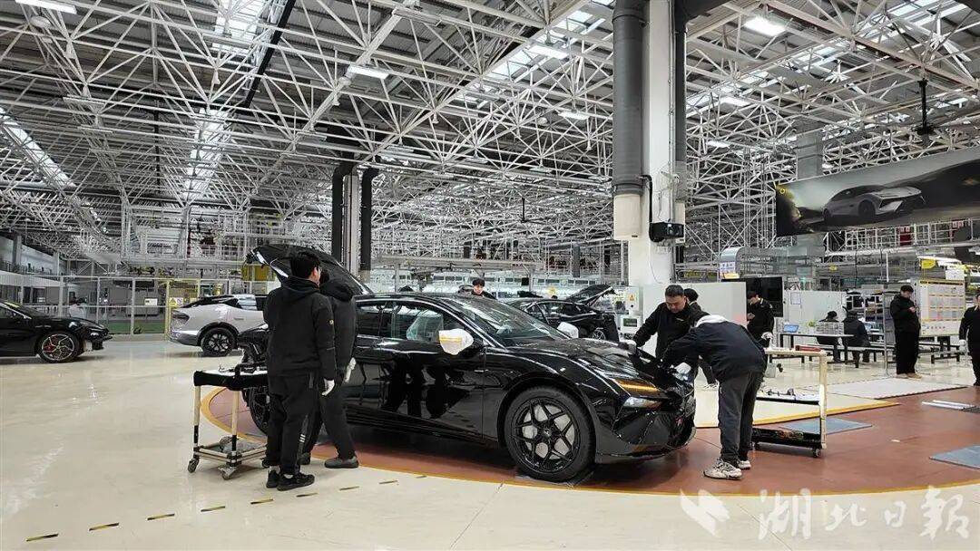 位于武汉经开区的莲花汽车公共智能工场,责任主谈主员正在总装车间内功课。(湖北日报全媒记者 杨文漪 摄)