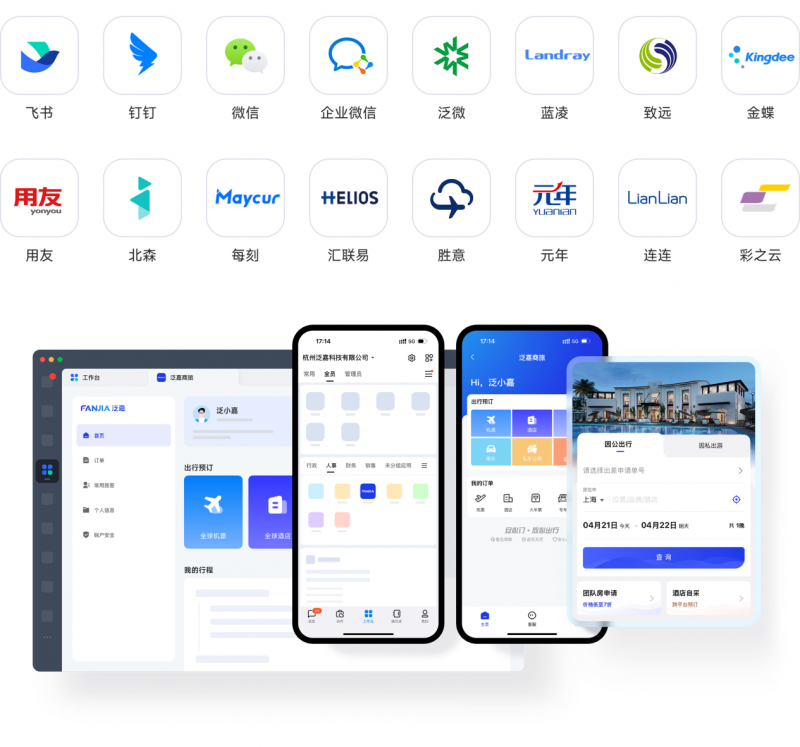 泛嘉已与国内主流OA/ERP/财务系统完成无缝对接,并与企业微信、钉钉、飞书杀青对接会通、互联互通,全场景系统端口一说念买通。