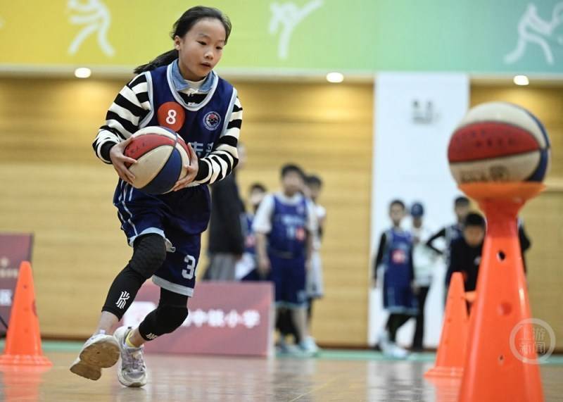 科场内,小球员们心思专注,挨次在规则的区域内完成运球绕桩、定点传球、上篮投篮等一系列限定手脚。